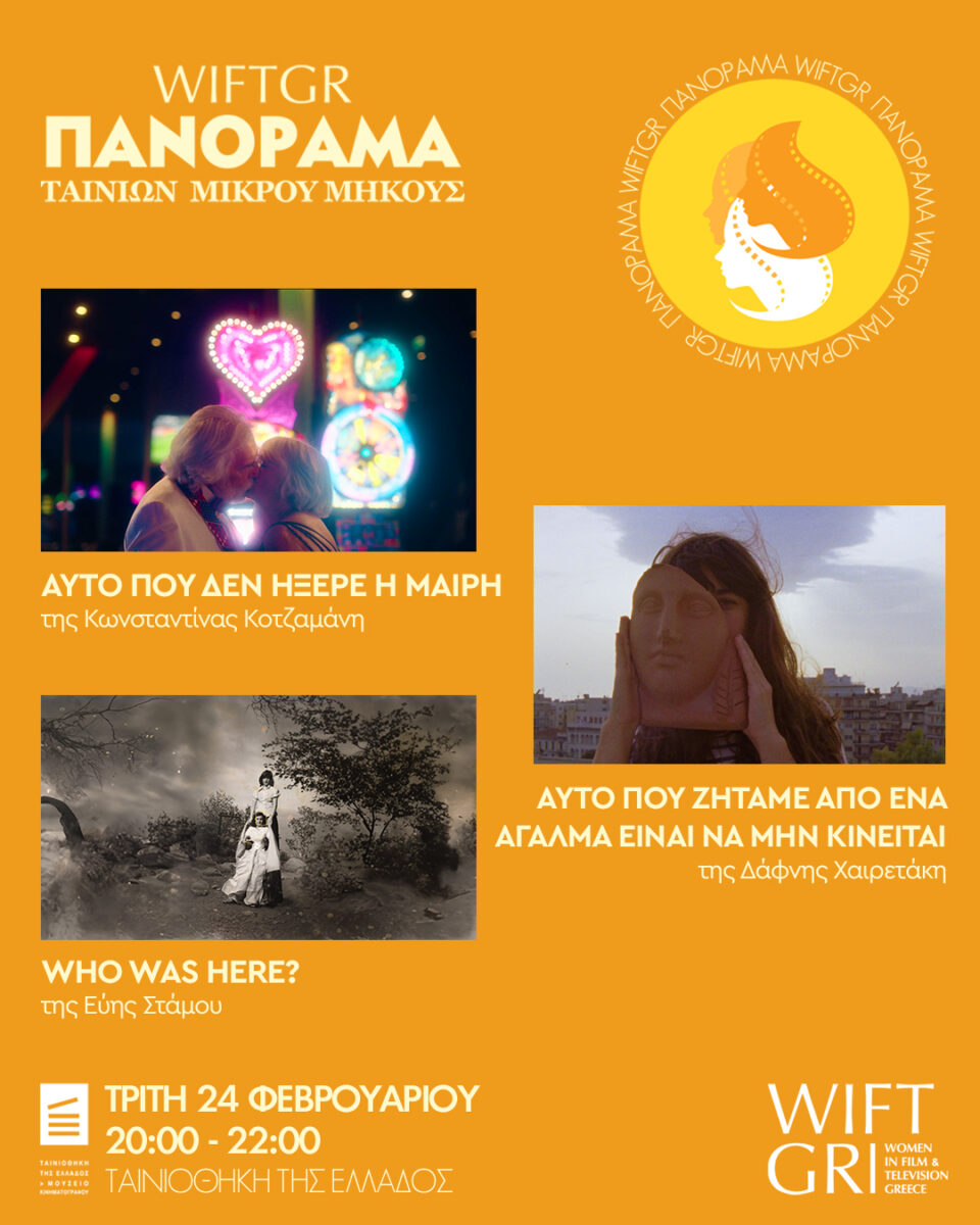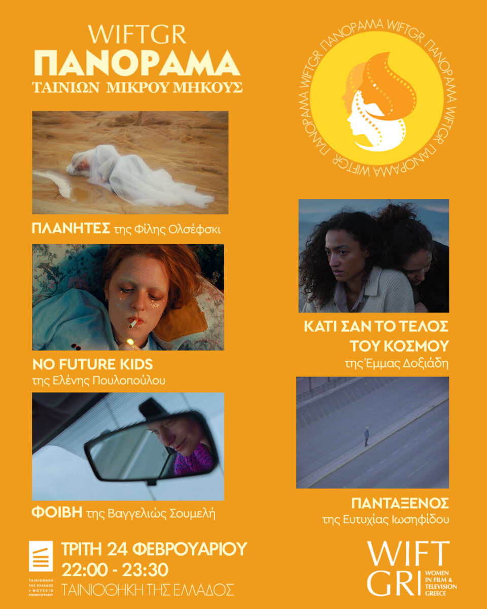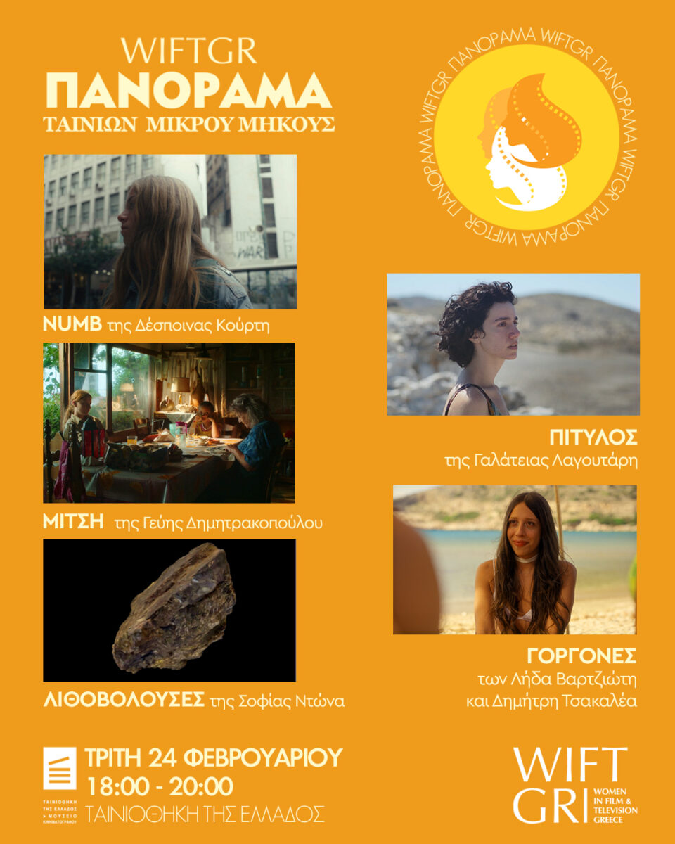 Οι WIFT GR – Women in Film and Television Greece διοργανώνουν ένα κινηματογραφικό διήμερο αφιερωμένο στη γυναικεία δημιουργία με τίτλο WIFT GR Πανόραμα Ταινιών Μικρού Μήκους. Οι προβολές θα πραγματοποιηθούν την Τρίτη 24 και την Τετάρτη 25 Φεβρουαρίου 2026 στην Ταινιοθήκη της Ελλάδος, με ελεύθερη είσοδο.